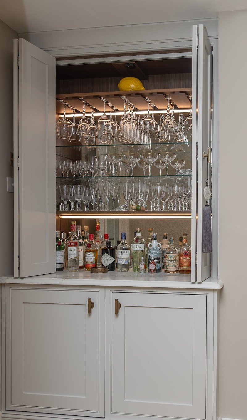 The addition of lighting makes the space a pleasure to use, such as lights that come on automatically when the doors open, so you can see everything clearly, especially in the evening. An addition of mirror splashback reflects the light softly, giving a bar area a warm and welcoming feel.