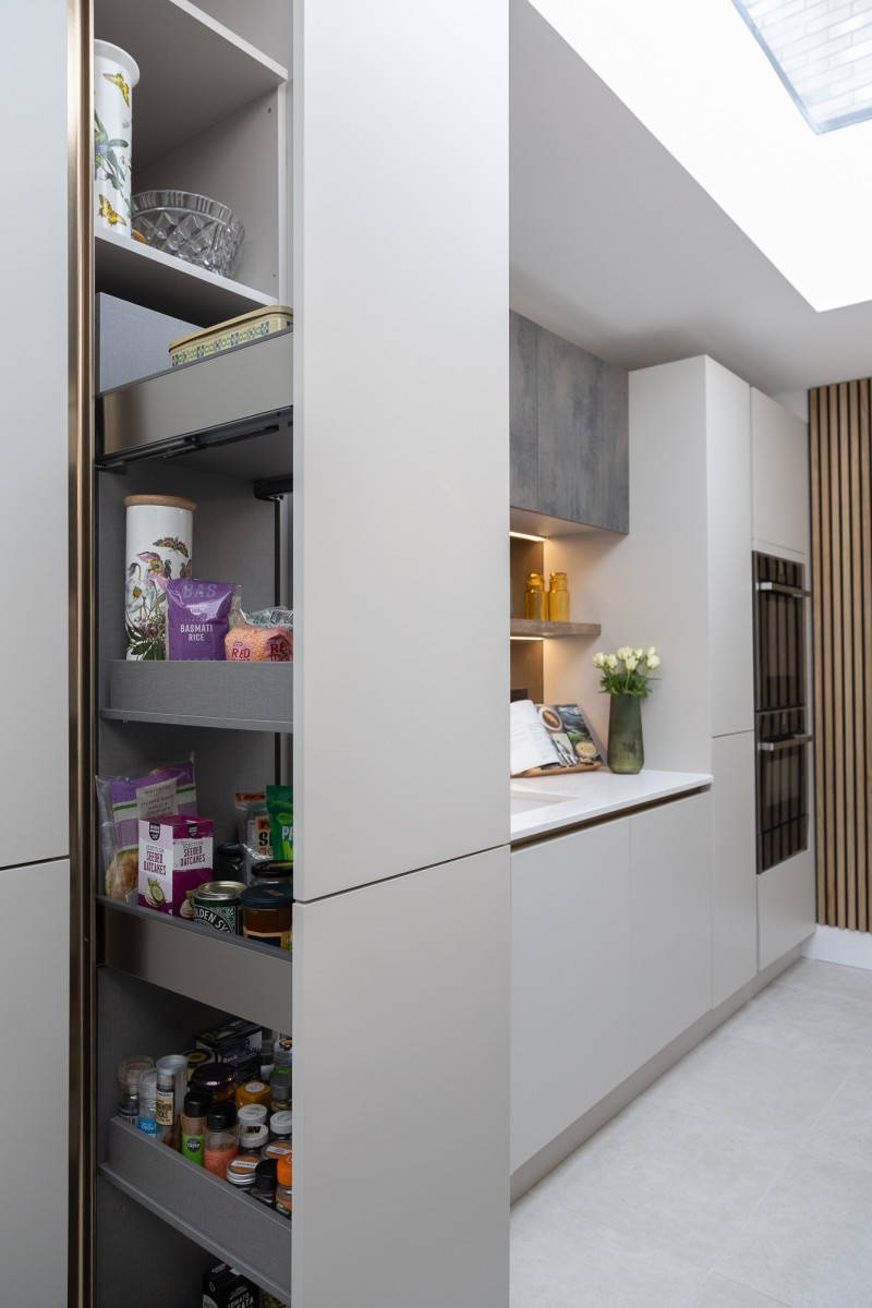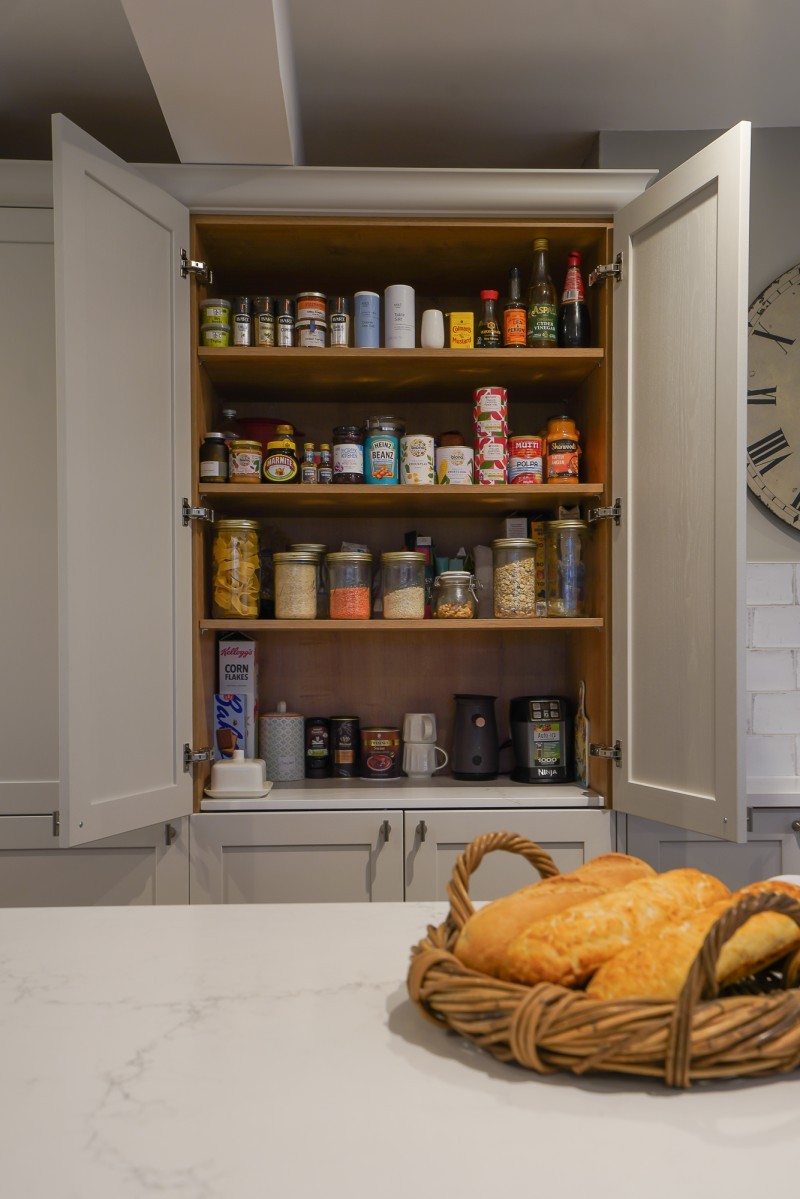 The overflow of the kitchen is neatly tucked away in a well-designed Haydown Kitchens pantry. By allocating cupboards and shelving in the right places, we can help you make the most of your space, making it easy to find the things you need.