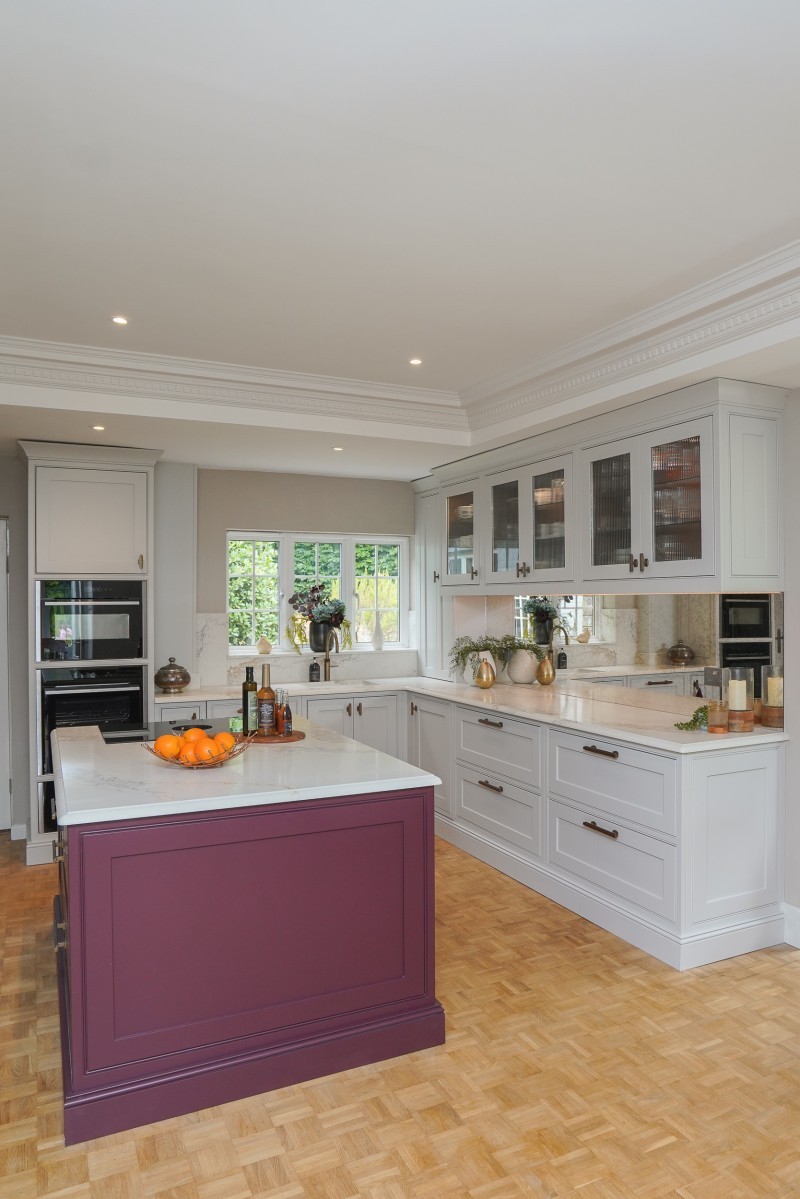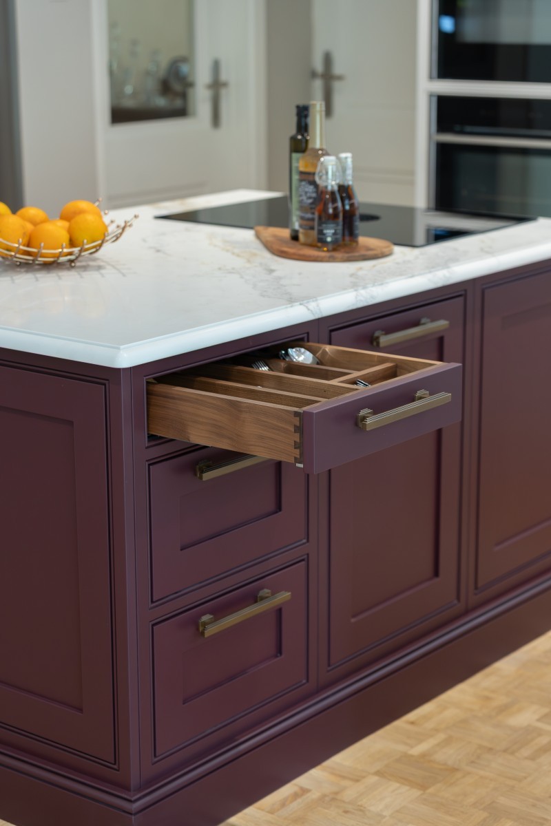 Our client chose a very pale shade of grey for the main cabinets and teamed this with a deep aubergine on the island. These two colours work beautifully together and are complemented by the burnished brass handles, the rich walnut interiors and the striking gold and grey veined worktop.