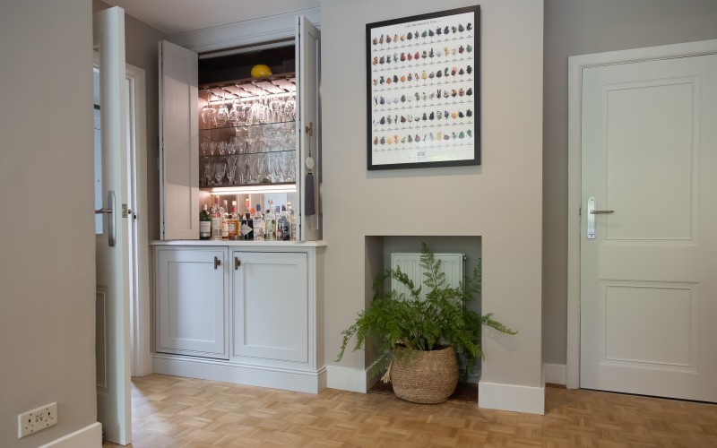 One of the standout features of this kitchen is the bespoke bar cabinet, which was designed precisely to our client’s specification. It includes deep drawers for bottles and snacks, an under-counter drinks fridge and built-in wine glass holders. It has automatic lights that come on as the doors open, illuminating the interior and adding to the atmosphere of the room. The back of the cabinet is finished with antique mirror glass which gently reflects the light and adds a touch of glamour.