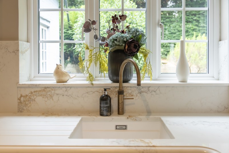 At the sink, a Quooker boiling water tap in patinated brass adds both practicality and charm. It has a warm, aged appearance which over time will continue to age and deepen in character.