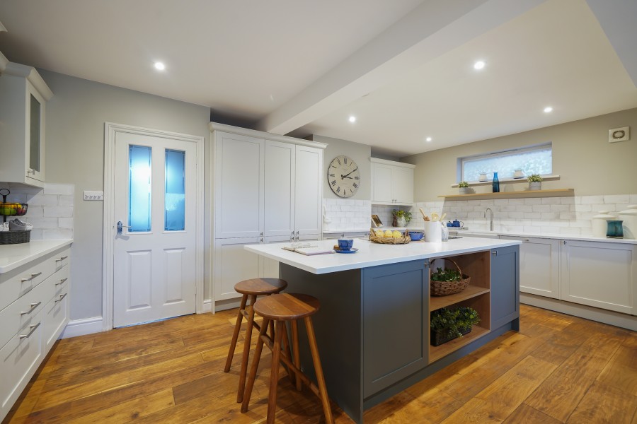 Christine and Roy’s beautiful new Shaker style kitchen has high-quality British-made furniture and is bespoke painted to match two Farrow & Ball colours. It is packed with modern features including a Quooker boiling water tap and a compact BORA venting cooktop.